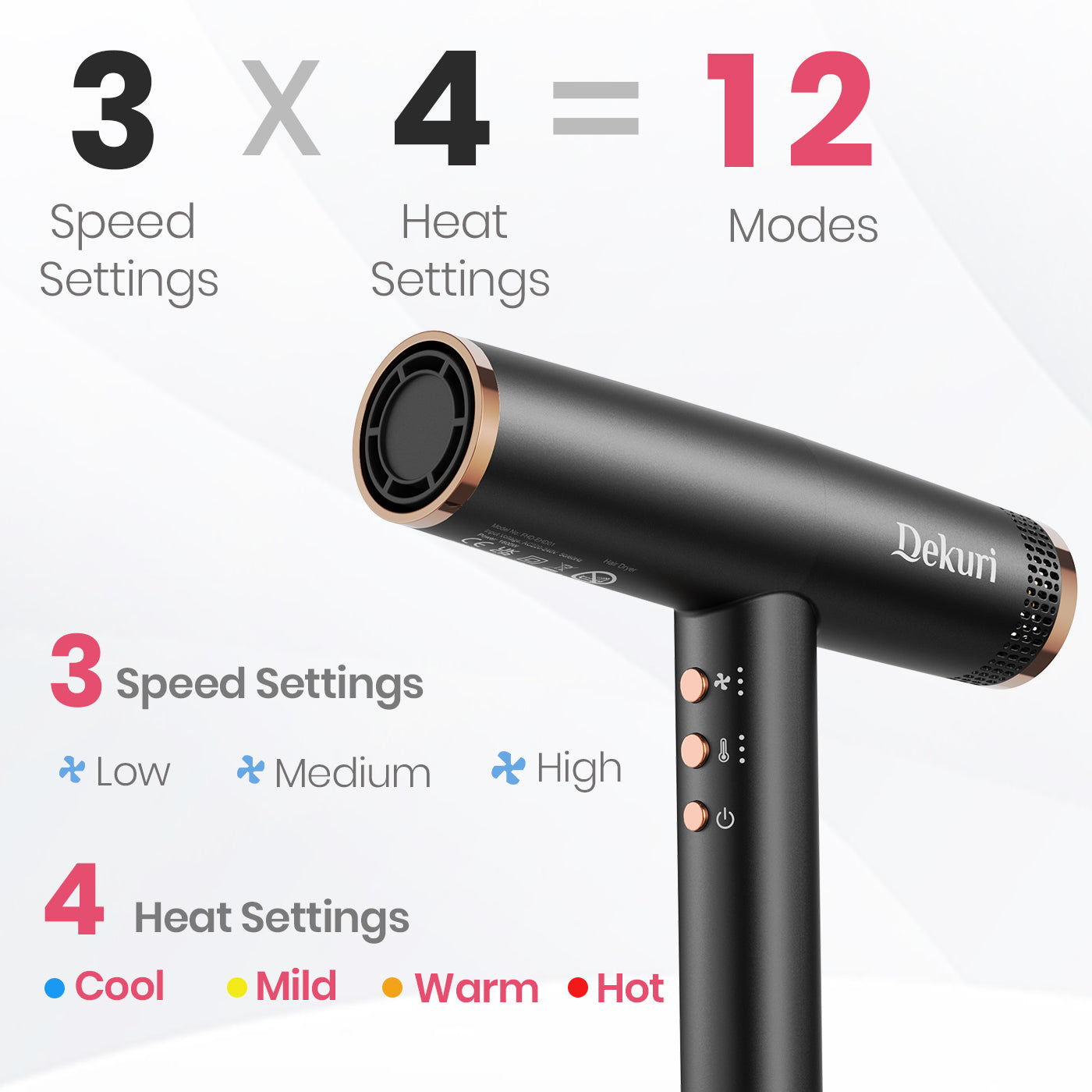 AirDry turbo Pro T2's 3-speed settings and 4 heat settings give you a total of 12 modes to suit every hair type and styling preference.